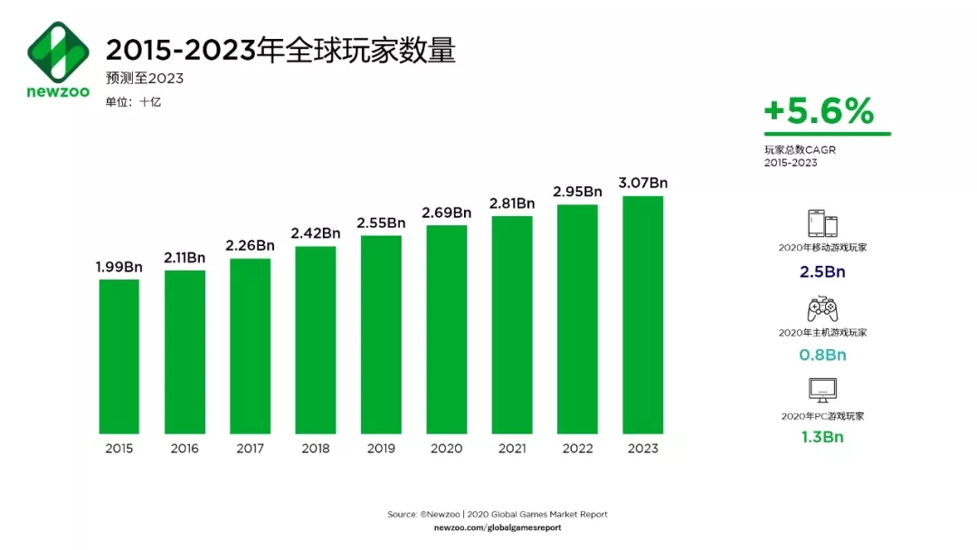 據(jù)Newzoo最新《2020年全球游戲市場報告》預(yù)測,全球游戲市場規(guī)模將達(dá)到1593億美元,同比增長9.3%;全球游戲玩家數(shù)量將持續(xù)增長,到2023年將超過30億。